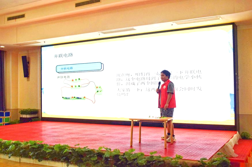 分发电路元件后,志愿者们逐步讲解搭建电路的要点及注意事项,并带领孩子们先后完成了串、并联电路的搭建。当孩子们自主连接电池、导线与开关,亲眼见证手中的灯泡渐次亮起时,他们或高举作品向同伴展示,或专注调整线路探究明灭规律,跃动的光斑映照着充满求知欲的眼眸。