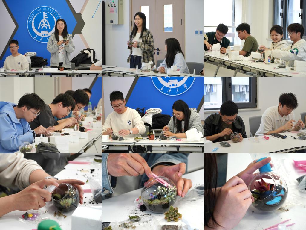 活动将园艺治疗与叙事疗法融入微景观创作。主持人从心理学视角阐释了接触泥土、种植植物对缓解压力的作用,以及通过选择砂石颜色、堆塑地形、摆放公仔等环节实现情绪投射的机制。在制作环节,同学们依次完成铺底、造地形、种植物与摆公仔四步,用蓝色砂石、绿色苔藓、高低土坡和各类小公仔构建出各自独特的“心理地图”。朋辈骨干穿梭其间,以支持性提问引导同学们探索作品背后的故事。